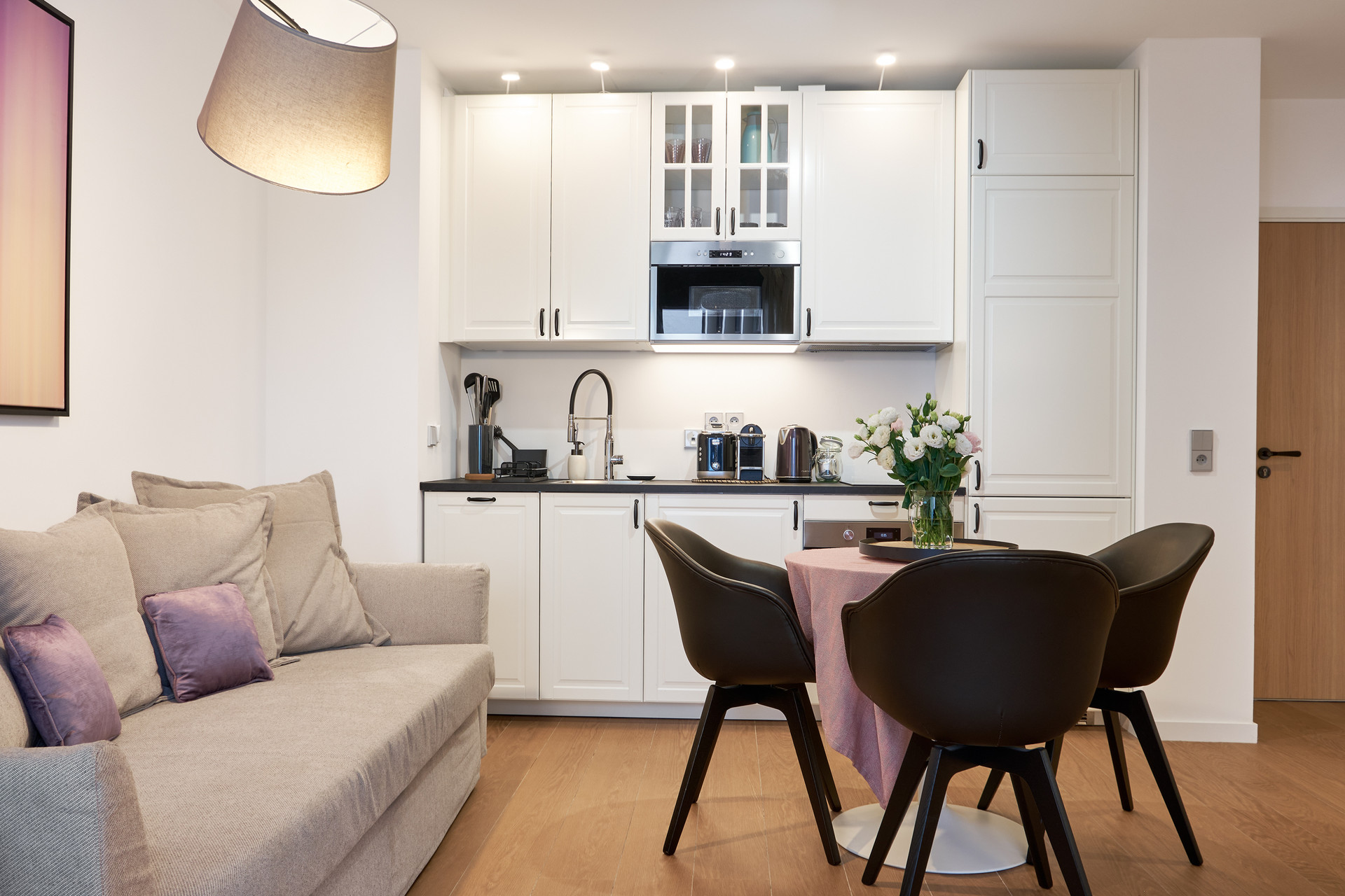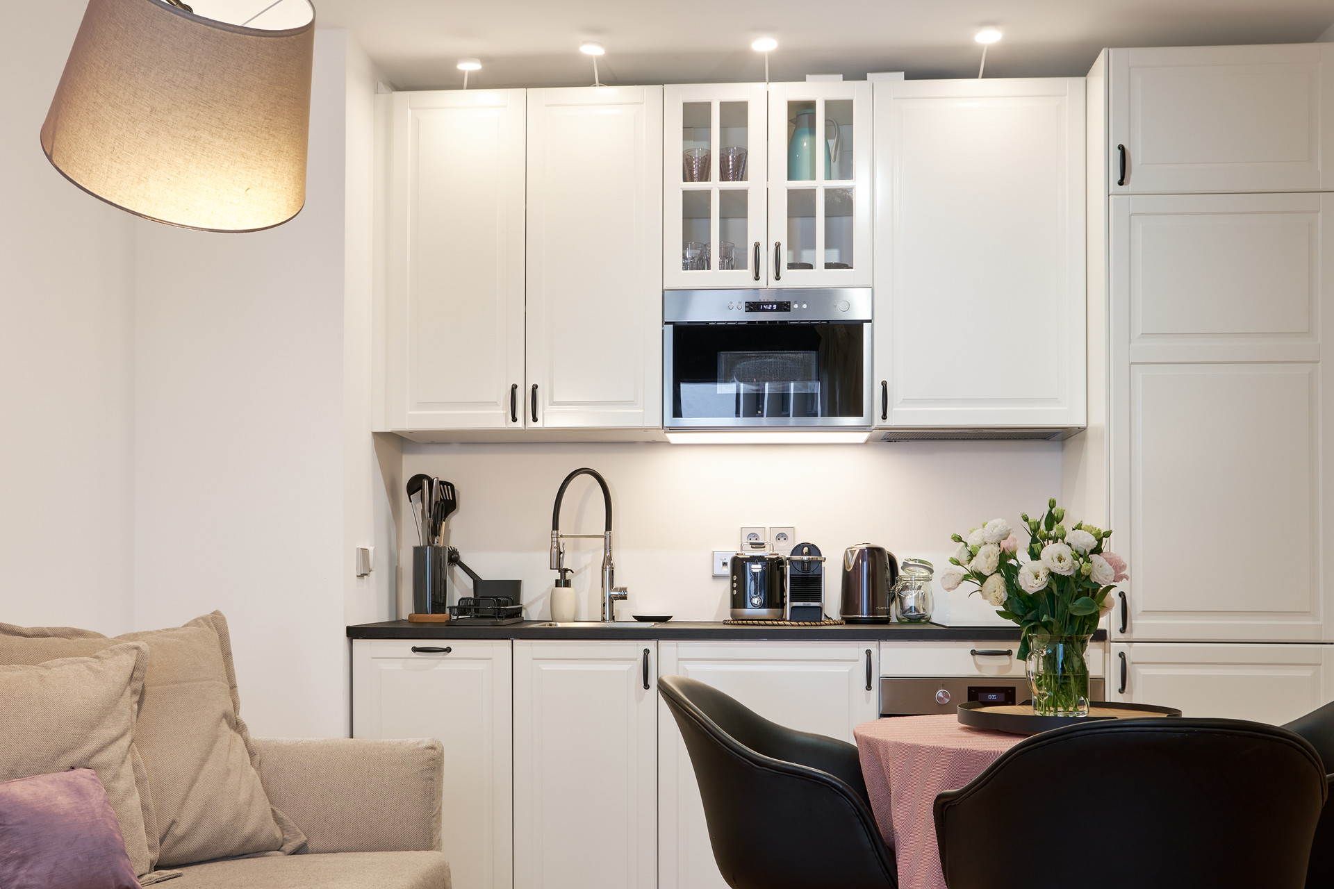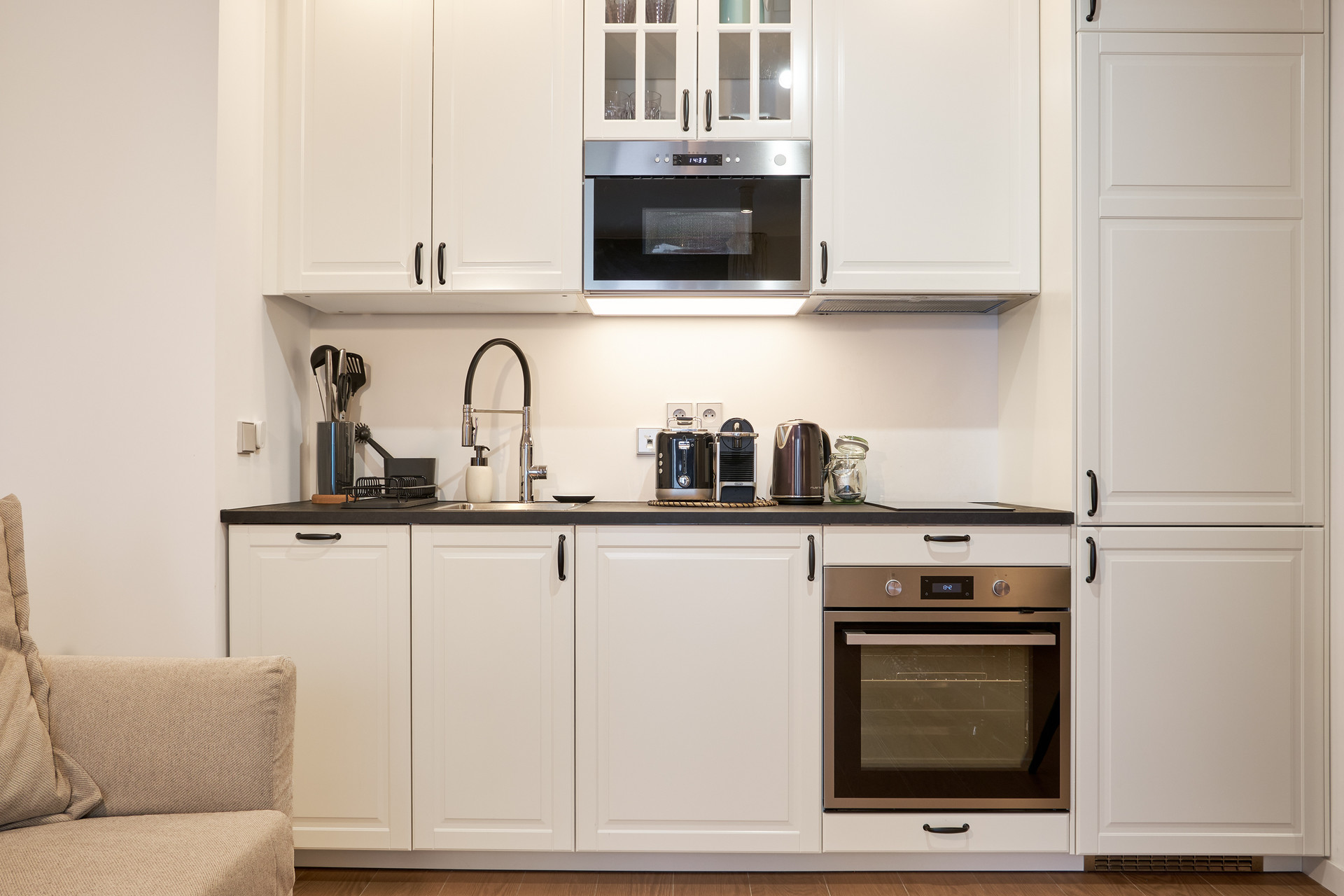 – Mini kitchen with oven, microwave, dishwasher, and all essential cookware
